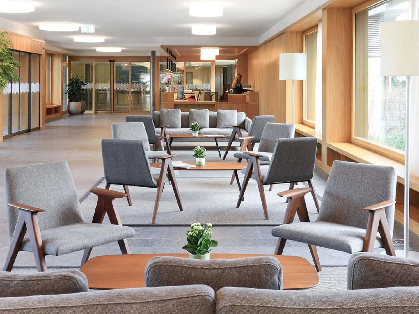 Here we see the lobby of the Alterszentrums Platten residence, by the lake of Zürich, which has been beautifully furnished with Libera armchairs and Solapa tables in walnut.