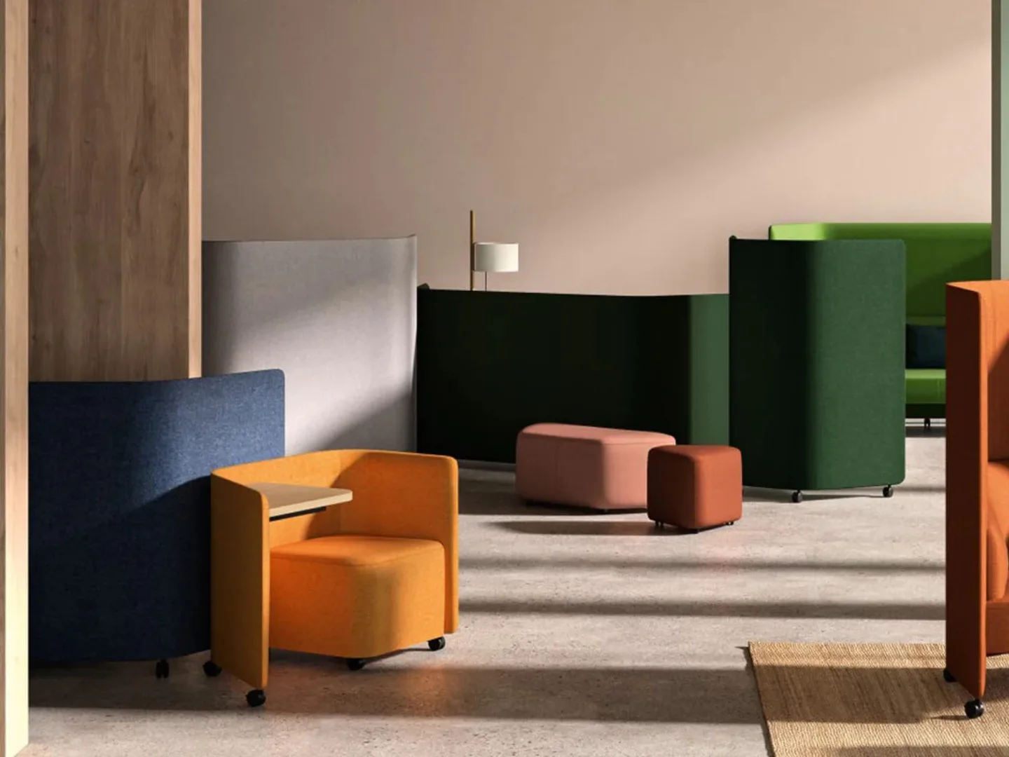 The In Out Office furniture system is designed to encourage productivity and offers an innovative approach to professional environments, particularly when hybrid working is the norm. Featuring a range of elements, including sofas, poufs and desks, the system incorporates acoustic reduction solutions to enhance privacy and soundproofing for individual focus or collaborative efforts. The modular design ensures versatility, and the addition of wheels to the modules further enhances adaptability, allowing for seamless reconfiguration to meet diverse needs in evolving work settings.