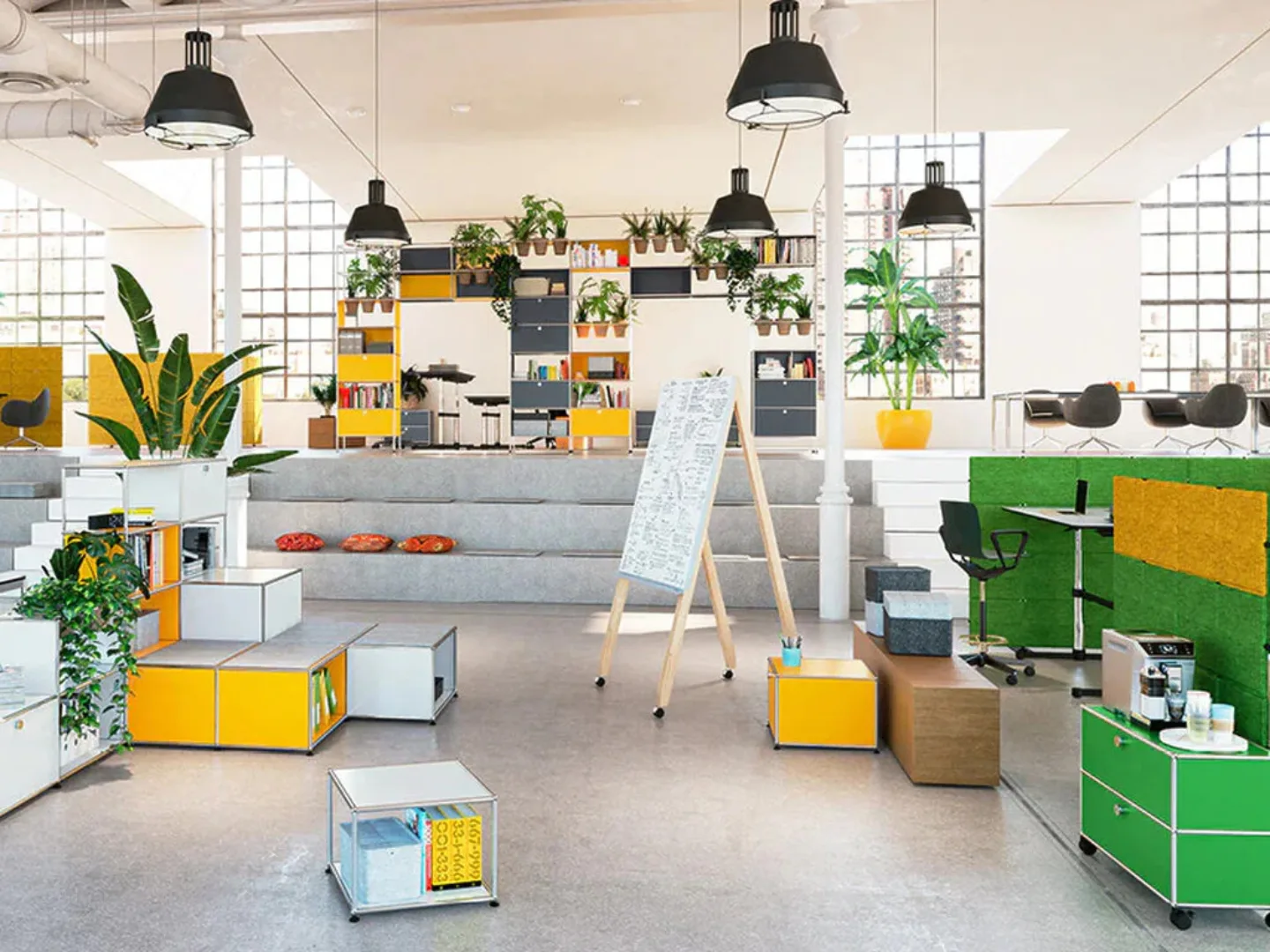 Here is a gorgeous example of an office environment whereby spontaneous interactions are encouraged, employees feel inspired, visitors feel welcome and colleagues feel at ease. Of course, this has all been made possible with the wonderfully versatile storage solution, Haller from USM. Sustainable and customisable, Haller is characterised by it’s steel tubes and colourful panels. The configurable system can be used as a wall divider, filing cabinet, trolley station, a place to house plants, the list goes on… Highly versatile and highly functional, it’s a workplace must-have and collaboration key!